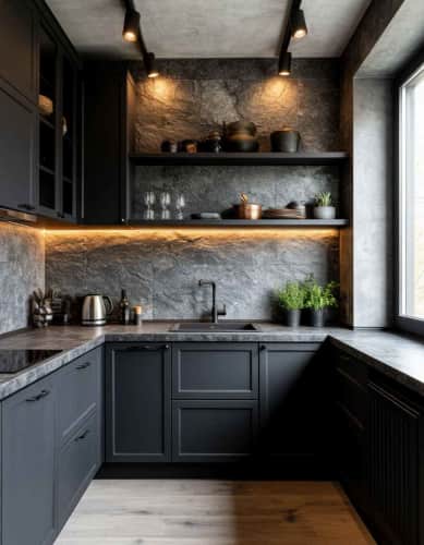Совет дизайнера: добавьте черную матовую фурнитуру, открытые полки, металлические детали — и кухня обретет максимально смелый характер.