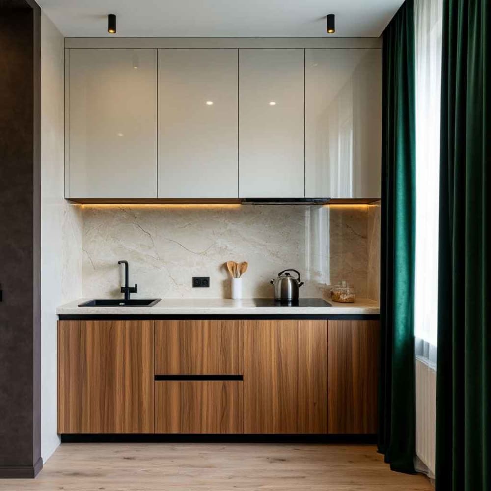 Представьте: светлая плитка с природной текстурой, минималистичная мебель, немного дерева — и вот уже ваша маленькая кухня выглядит как страница из интерьерного журнала.